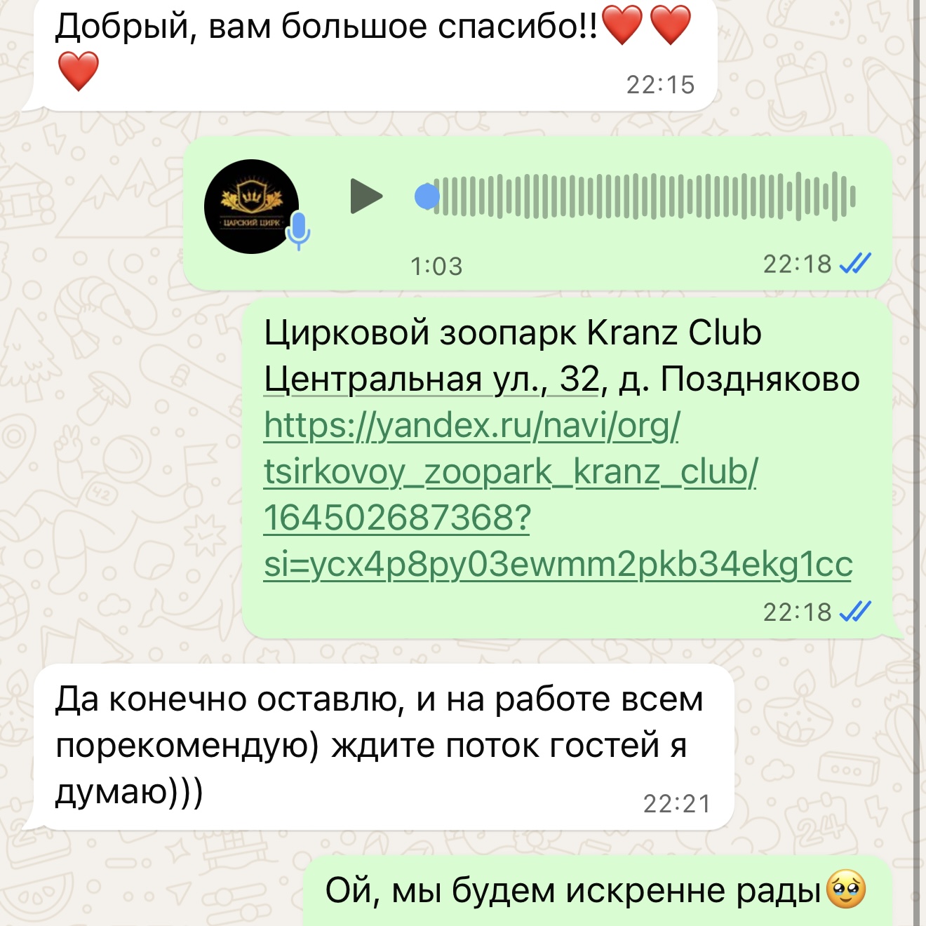 Друзья, рады сообщить Вам, что мы открыли загородный клуб, всего в 9км от МКАД по Новорижскому шоссе. У нас Вы можете отпраздновать любое событие, провести съемки с животными и без, а также, просто погулять и пообщаться с питомцами Царского Цирка.